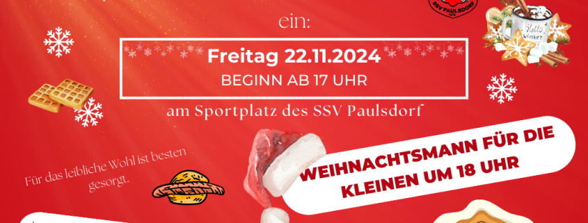 Am 20. November war es wieder soweit: Der Sportplatz in Paulsdorf verwandelte sich in ein vorweihnachtliches Winterwunderland. Bereits zum zweiten Mal fand der „Vorweihnachtliche Winterzauber“ statt und lockte zahlreiche Besucher an. Bei idyllischem Winterwetter mit leichtem Schneefall erlebten die Gäste einen Abend voller festlicher Stimmung und gemütlichem Beisammensein.